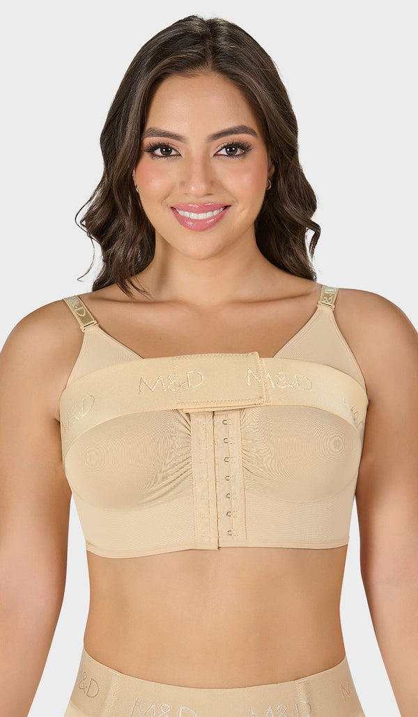 Brasier posquirúrgico con espalda cubierta, incluye estabilizador de busto ajustable con velcro para tu comodidad e ideal en tu posquirúrgica de implante. Cuenta con tiras graduables que se ajustan a la medida así como 2 niveles de abrochadura.